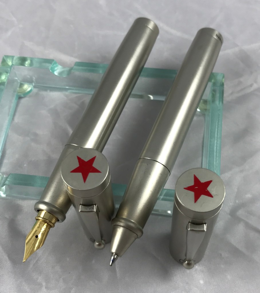This fountain pen and ballpoint set was made about 1990. They are 5″ each and hefty.
