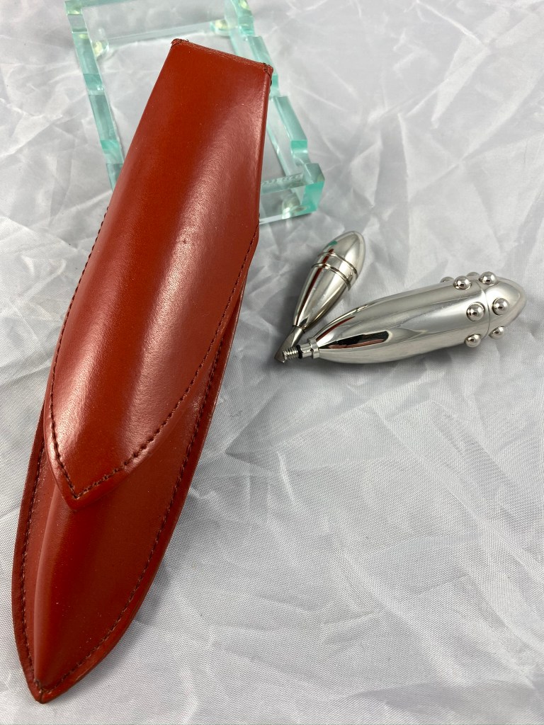 Jean Pierre didn’t want to incorporate the ink-holder inside the pen so that the user wouldn’t have to dip the end in ink. The ink-holder is external so that ink can be sucked from an ink-bottle, the holder can then be screwed onto the pen, and ink injected into it.