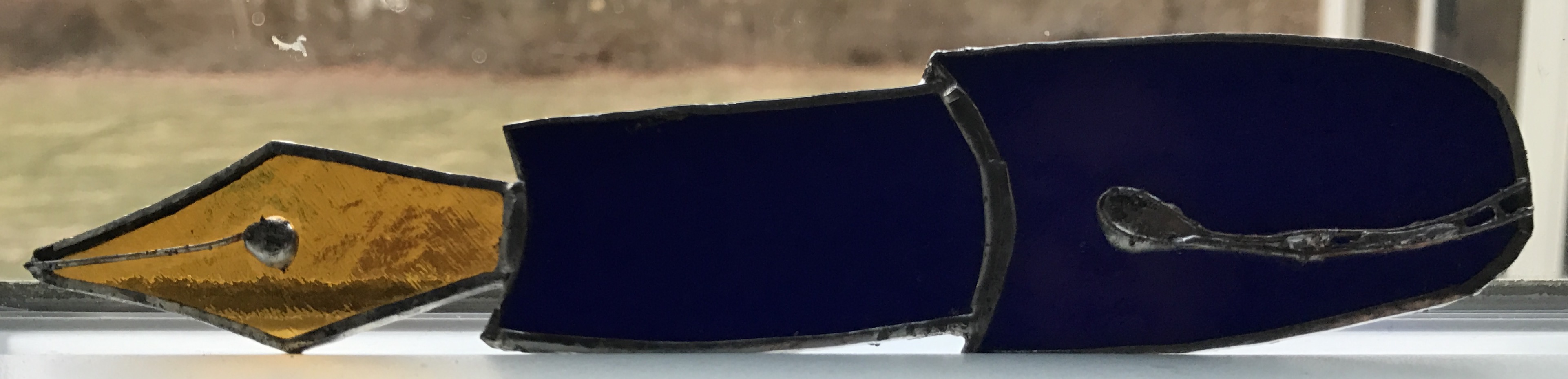 Stained Glass Blue Fountain Pen Posted on January 28, 2017May 1, 2017 by Tom Stained Glass opaque blue fountain pen. This was my first version of a fountain pen. I like the large nib with a simulated ‘slit’. Approximately 7″ x 1 ½″. Asking $45 +shipping Ask about this item: ← BackThank you for your response. ✨ Name(required) Email(required) Comment(required) Submit Δ Related