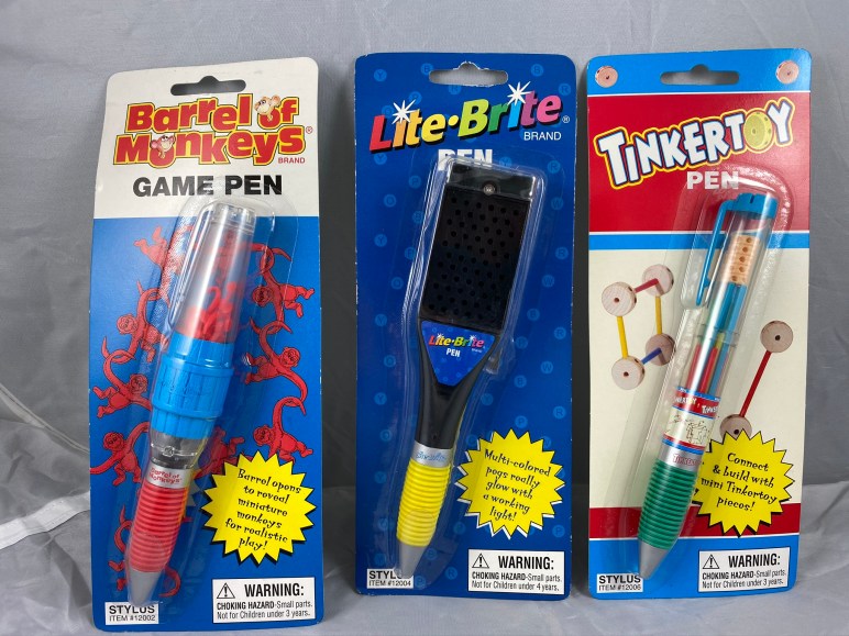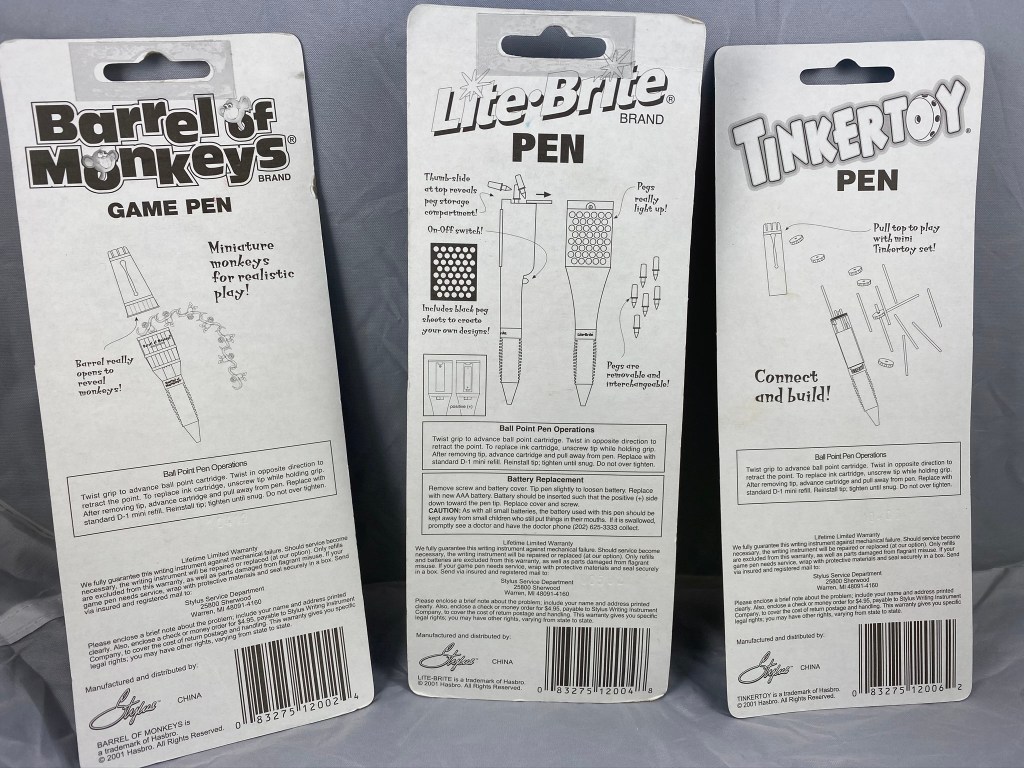 Each new-in-package includes a twist action ballpoint pen by the Stylus Writing Instrument Company with a built in, working toy. They appear to be from around 2001 and while I cannot guarantee the refills write as they are, they are made to be refillable using a standard D-1 mini refill.